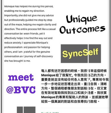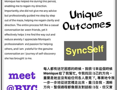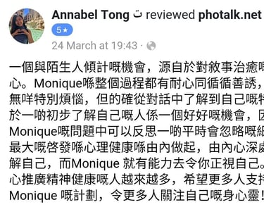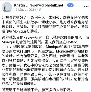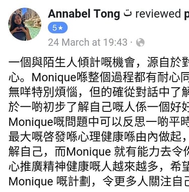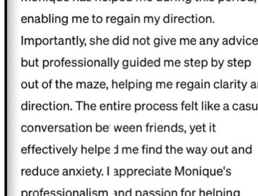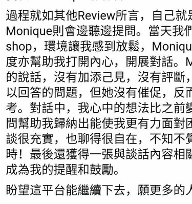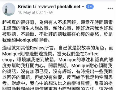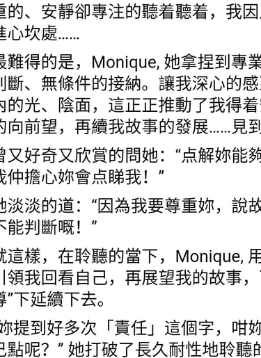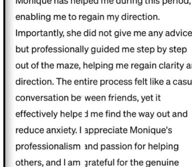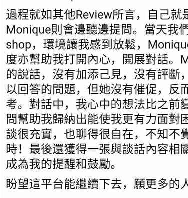 “Everyone experiences confusion and perplexity at times. I am fortunate that Monique has helped me during this period, enabling me to regain my direction. Importantly, she did not give me any advice but professionally guided me step by step out of the maze, helping me regain clarity and direction. The entire process felt like a casual conversation between friends, yet it effectively helped me find the way out and reduce anxiety. I appreciate Monique's professionalism and passion for helping others, and I am grateful for the genuine conversation and journey of self-discovery she has brought to me. ”