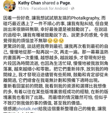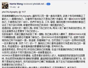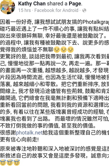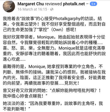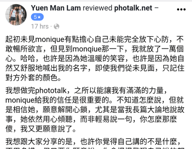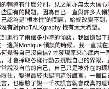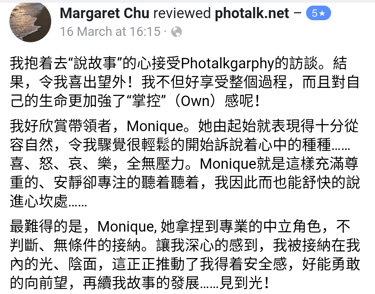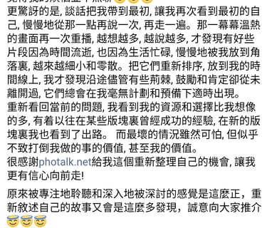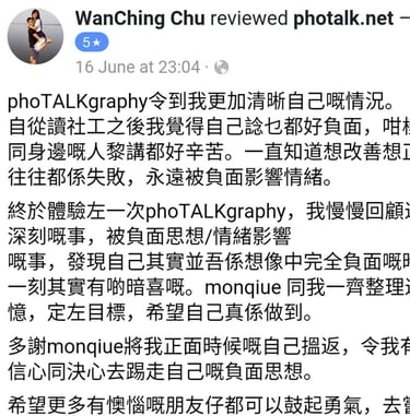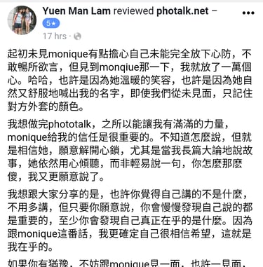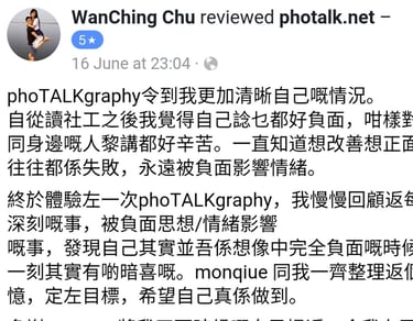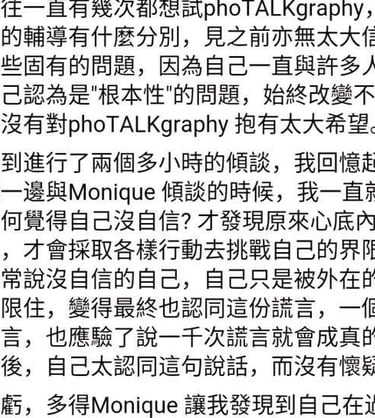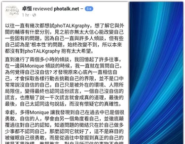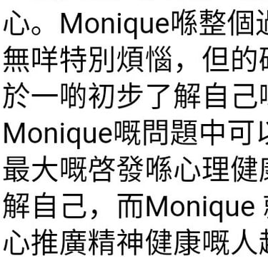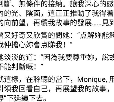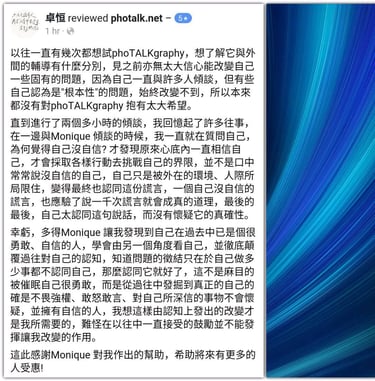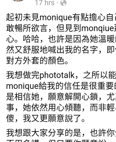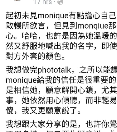 This opportunity allows me to extract some strength from my busy life, providing to myself that I am not what others may label me as. Focusing on the theme of family, I hope to write a brief summary for myself. Fortunately, in this period of time, I found important sentences and words related to my life without denying my past. Like the term 'elder sister,' although it may be a simple term, it gave me the motivation to cherish myself and think about starting anew. As you continued to delve into the meaning behind it, it helped me find its significance in my heart. It's not just about perspectives on family; it also affirmed my problem-solving abilities. Your responses gave me a hopeful feeling about the future, and even after this deep conversation, I can continue to reflect and have space for self-discovery, symbolized by the long-lost family portrait you provided. I appreciated Monique's patience, giving me time to reflect on and savor things I had wanted to forget. She provided me with an opportunity to rediscover a version of myself that I can strive for -- a self with ideals and the ability to be moved. Seeing the dream-chasing and upward-striving friends around me, I want to share this beautiful experience of the journey with everyone. For friends familiar with Narrative Therapy, I sincerely recommend this page because good things are meant to be shared together. Since my words only represent one perspective, others won't fully feel the strength behind it. Therefore, I encourage everyone to check it out and experience it with Monique."