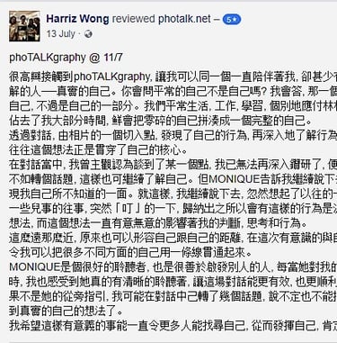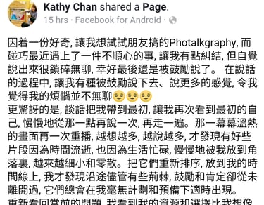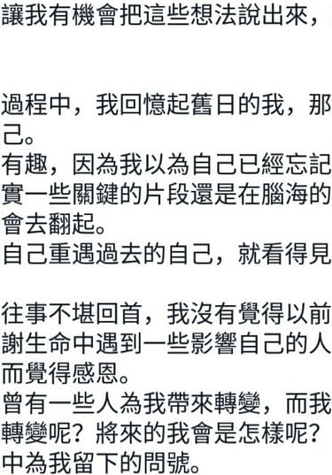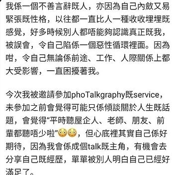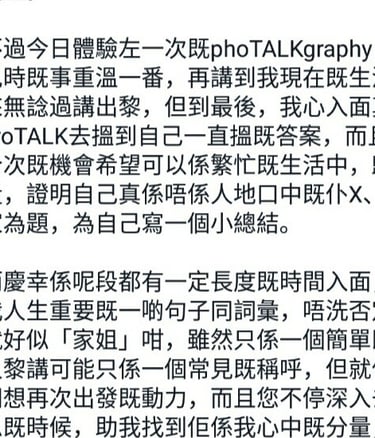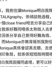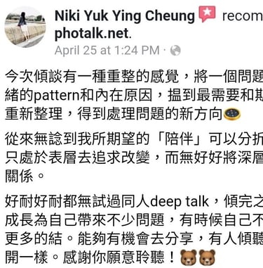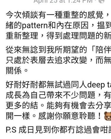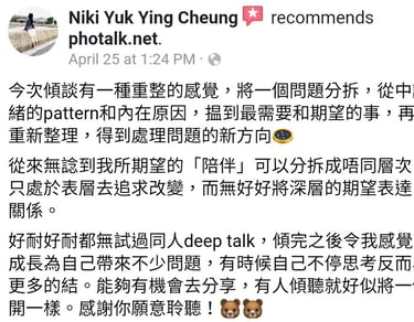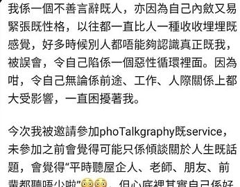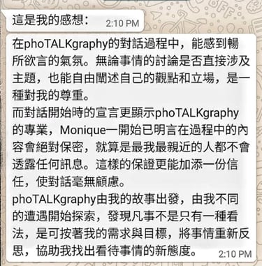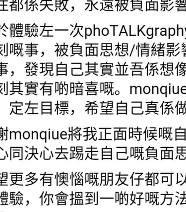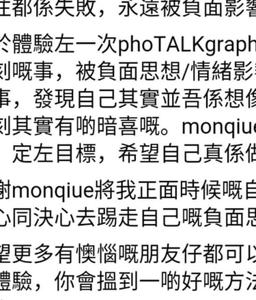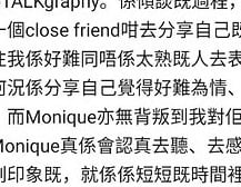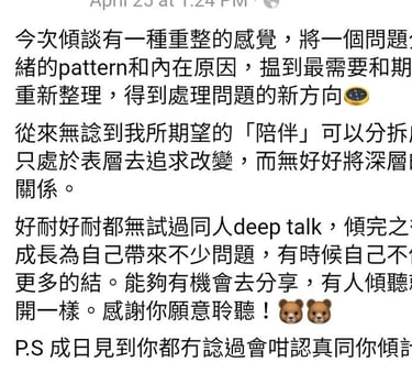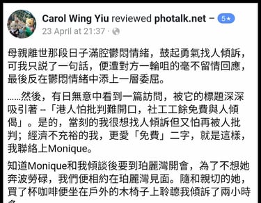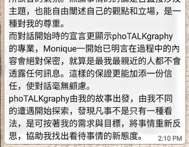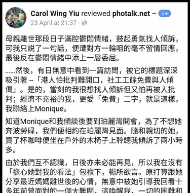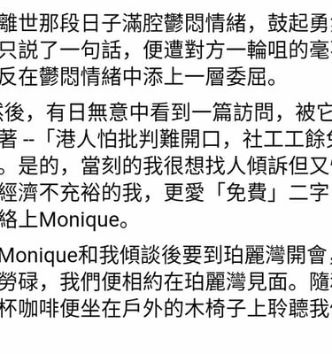 Then, one day, I stumbled upon an interview with a title that deeply resonated with me: "Hong Kongers Fear Criticism and Hesitate to Open Up; Social Worker Offers Free Conversations in Spare Time." Yes, in that moment, I desired to talk to someone but feared facing judgment again. Being economically constrained, the word "free" was especially appealing to me. That's when I contacted Monique.