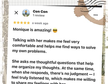 "Out of curiosity, I decided to give, Monique, the service a try. Coincidentally, I was facing some recent setbacks that left me feeling somewhat entangled. I felt like voicing them out would be trivial and boring, but thankfully, I eventually found the encouragement to share. Throughout the conversation, I felt encouraged to keep talking, to share more. This made me realize that my worries weren't mundane at all.
