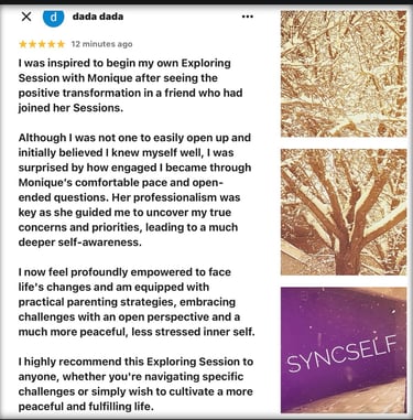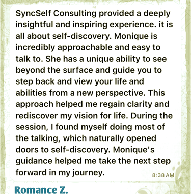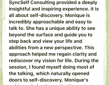 "SyncSelf Consulting provided a deeply insightful and inspiring experience. It is all about self-discovery. Monique is incredibly approachable and easy to talk to. She has a unique ability to see beyond the surface and guide you to step back and review your life and abilities from a new perspective. This approach helped me regain clarity and rediscover my vision for life. During the session, I found myself doing most of the talking, which naturally opened doors to self-discovery. Monique's guidance helped me take the next step forward in my journey."