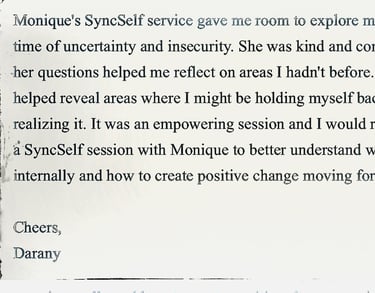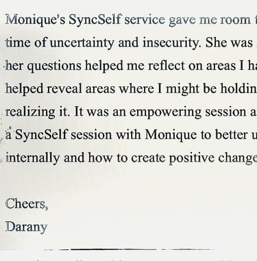 "Monique's SyncSelf services gave me room to explore my future during a time of uncertainty and insecurity. She was kind and compassionate, and her questions helped me reflect on areas I hadn't before. Our discussion helped reveal areas where I might be holding myself back without realizing it. It was an empowering session and I would recommend having a SyncSelf session with Monique to better understand what is happening internally and how to create positive change moving forward."