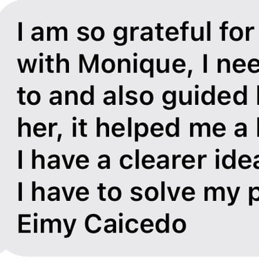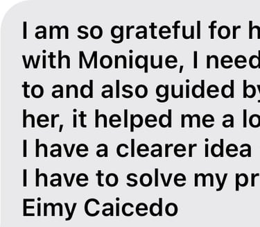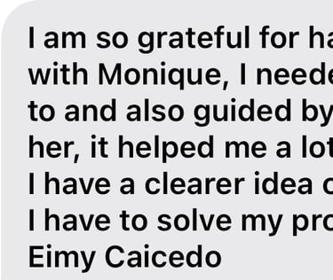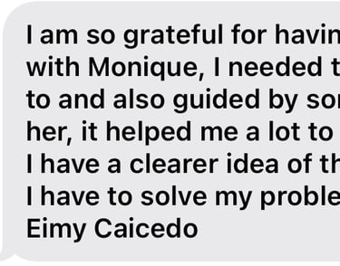 “I am so grateful for having this session with Monique, I needed to be listened to and also guided by someone like her, it helped me a lot to vent and how I have a clearer idea of the alternatives I have to solve my problems now.”