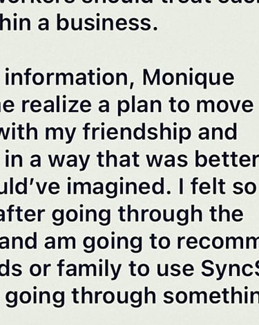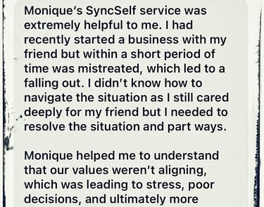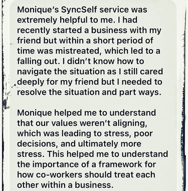 "Monique's SyncSelf service was extremely helpful to me. I had recently started a business with my friend but within a short period of time was mistreated, which led to a falling out. I didn't know how to navigate the situation as I still cared deeply for my friend but I needed to resolve the situation and part ways.