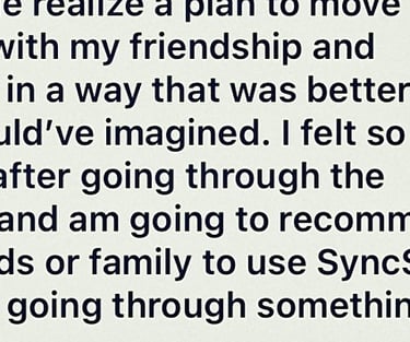 With this information, Monique helped me realize a plan to move forward with my friendship and business in a way that was better than I could've imagined. I felt so relieved after going through the exercise and am going to recommend any friends or family to use SyncSelf if they're going through something similar."
