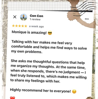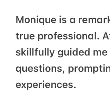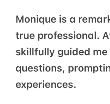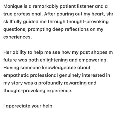 Monique is a remarkably patient listener and a true professional. After pouring out my heart, she skillfully guided me through thought-provoking questions, prompting deep reflections on my experiences.