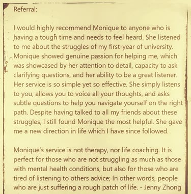 “I would highly recommend Monique to anyone who is having a tough time and needs to feel heard. She listened to me about the struggles of my first-year of university. Monique showed genuine passion for helping me, which was showcased by her attention to detail, capacity to ask clarifying questions, and her ability to be a great listener. Her service is so simple yet so effective. She simply listens to you, allows you to voice all your thoughts, and asks subtle questions to help you navigate yourself on the right path. Despite having talked to all my friends about these struggles, I still found Monique the most helpful. She gave me a new direction in life which I have since followed.